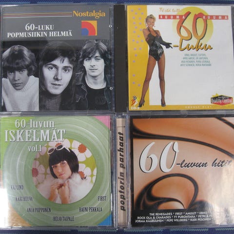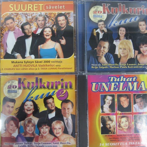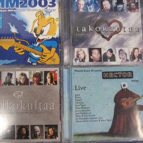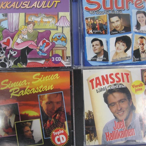 Myydään kotimaisia kokoelma cd-levyjä 3,00 euroa kappale. Kaikki cd:t kuunneltu ja todettu toimiviksi. Cd:ssä voi olla naarmuja & kansipapereissa jälkiä/omistuskirjoituksia, mutta cd-kotelot ovat ehjät. Postituskulut ostajalle ja noutokin sovittavissa.