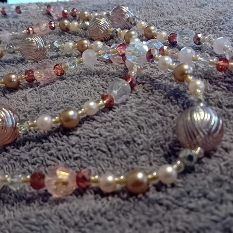Vähän hienostuneempi avainnauha turvalukolla. On vaaleanpunaista, kultaa ja blingblingiä. Vahva korunyöri.