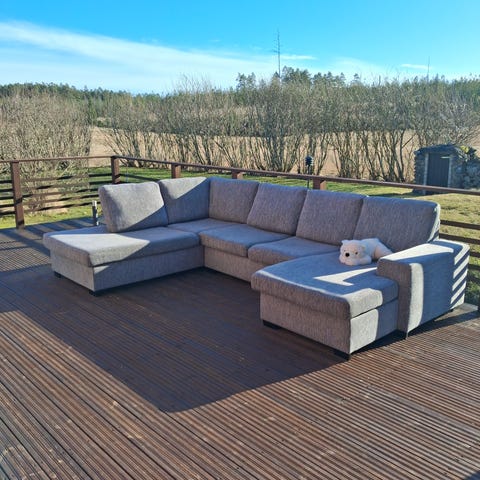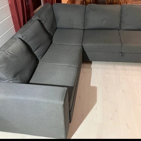 Ostan tai otan vastaan kulmasohvan. Käsinojat pitää olla molemmissa päädyissä. Ei nahkaista,eikä kovin vaaleaa.