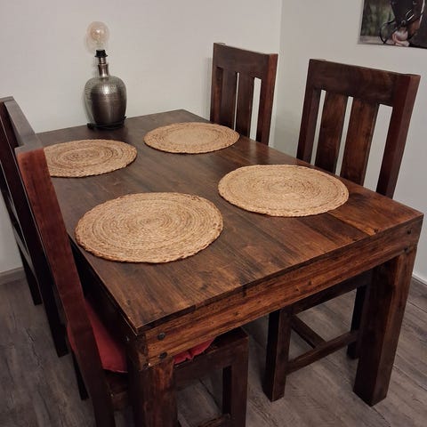 Pöydässä pientä kulmaa pinnassa mutta ei haittaa ruokailua.