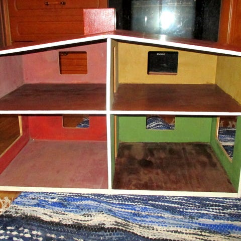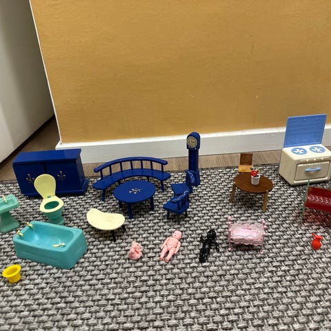 Vintage englantilainen 50-luvulla valmistettu nukkekodin leikkikeittiö. 4 osaa, tiskipöytä, hella, jääkaappi ja astiakaappi. Jokaisessa lukee Made in gt.britain