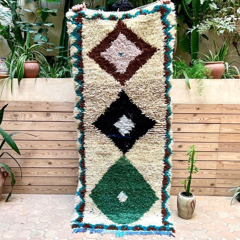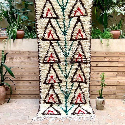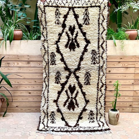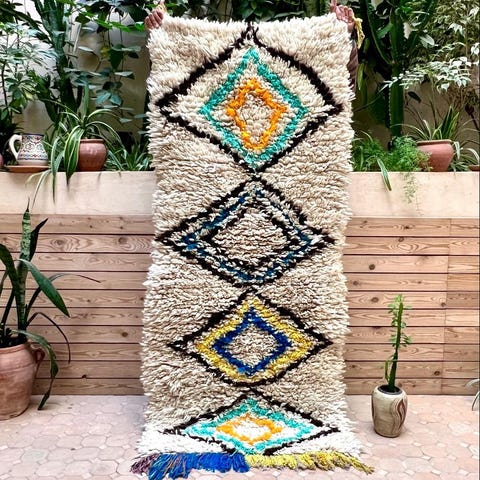 Ihana marokkolainen paimentolaismatto. Matto on kotoisin Marokon Azilal-kylästä. Mielenkiintoisesti Azilal-matot ovat löydetty vasta viime vuosikymmeninä. Niissä on usein valkean pohjan lisäksi ihastuttavia värejä symbolisissa yksityiskohdussa. Matot ovat alunperin käsinsolmittu omaan kotiin. Azilal-matot valmistetaan lampaanvillasta, johon on joskus sekoitettu puuvillaa yksityiskohtia varten.Kulumaa reunoissa, ei vaikuta käyttöön. Huomioitu hinnassa.