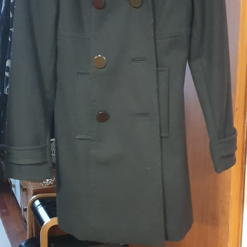 Tyylikäs, siisti, kevyt A- mallinen villakangastakki. Olkapäillä kivat rypytykset. Siisti ja puhdas, myös kaulukset, aina käytetty huivia.