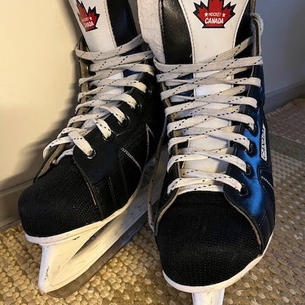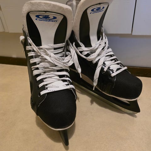 Canadian 100 jääkiekko luistimet koko 44 (noin 28cm) . Luistimet testattu ja pystyy luistelemaan ihan hyvin mutta toki teroitettuna parempi, oli vaan liian pienet joten nämä kiertoon :)