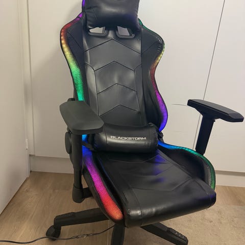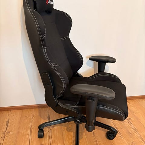 Pelituoli mustalla ja punaisella värityksellä. Tuolissa on pehmustettu istuin ja selkänoja, säädettävät käsinojat sekä pyörät alla liikkuvuutta varten.