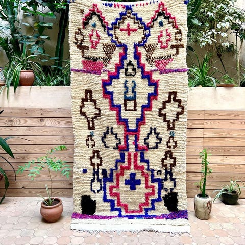 Ihana marokkolainen paimentolaismatto. Matto on kotoisin Marokon Azilal-kylästä. Mielenkiintoisesti Azilal-matot ovat löydetty vasta viime vuosikymmeninä. Niissä on usein valkean pohjan lisäksi ihastuttavia värejä symbolisissa yksityiskohdussa. Matot ovat alunperin käsinsolmittu omaan kotiin. Azilal-matot valmistetaan lampaanvillasta, johon on joskus sekoitettu puuvillaa yksityiskohtia varten.Kulumaa reunoissa, ei vaikuta käyttöön. Huomioitu hinnassa.