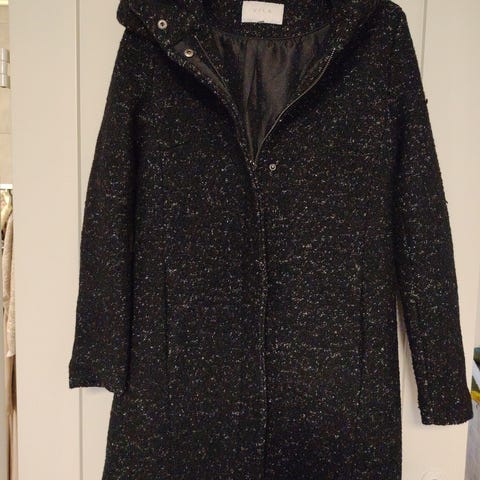 Uudenveroinen Junge villakangastakki. Takissa on vuori, päällikankankaassa villaa 10%. Takin pituus n 78cm, itsellä ulottuu reiden puoliväliin. Kauluksen voi nostaa ylös lämmittämään tai jättää alas. Nappikiinnitys.