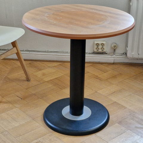 Annetaan ok kunnossa oleva tukeva musta pyöreä pöytä. Pöydän halkaisija 100cm, korkeus 75cm.