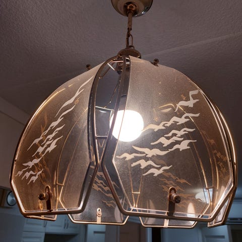 Tyyppi: lasipaneeleista koottu riippuvalaisin metalliosat kullanvärinen.mitat: halkaisija 48cm korkeus 27cm ketju ja yläkupu 38 cm. Koska valaisin on lasia ,niin en ota vastuuta mahdollisesta lähetyksessä vaurioitumisesta.
