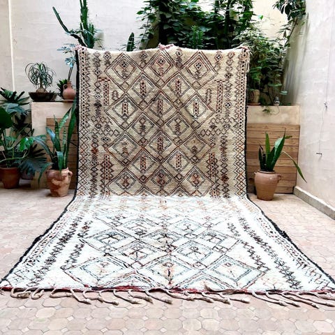 Aito vanha marokkolainen beni Ouarain paimentolaismatto! Vanhat beni Ouarain -matot ovat kuuluisimpia marokkolaisista matoista. Ne ovat erinomaisen laatuista pehmeää värjäämätöntä lampaanvillaa korkealta vuoristosta. Nykyään lähes kaikkia marokkolaisia mustavalkoisia mattoja kutsutaan virheellisesti beni ouaraineiksi, mutta tämä on ihan oikeasti sen ainoan oikean Ouarain heimon valmistama vuosikymmeniä sitten. Matossa on kaunista heimosymboliikkaa ja kieltä, joita kylän naiset kirjailijavat kotiinsa valmistamiin mattoihinsa. Näitä mattoja jo Alvar Aalto, Le Corbusier ja lukuisat muut arkkitehdit suosivat, ja vastaavia mattoja on edelleen Artekin valikoimissa. Aitoja vanhoja beni ouaraineja ei ole enää runsaasti jäljellä, joten tämä matto on keräilykappale.
