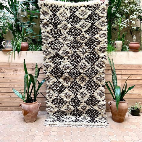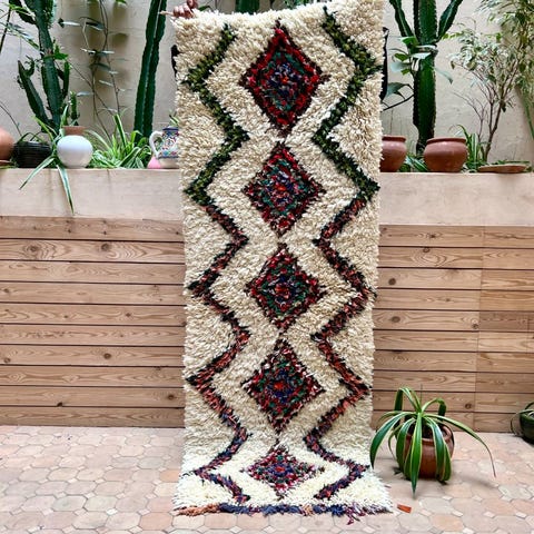 Ihana marokkolainen paimentolaismatto. Matto on kotoisin Marokon Azilal-kylästä. Mielenkiintoisesti Azilal-matot ovat löydetty vasta viime vuosikymmeninä. Niissä on usein valkean pohjan lisäksi ihastuttavia värejä symbolisissa yksityiskohdussa. Matot ovat alunperin käsinsolmittu omaan kotiin. Azilal-matot valmistetaan lampaanvillasta, johon on joskus sekoitettu puuvillaa yksityiskohtia varten.Kulumaa reunoissa, ei vaikuta käyttöön. Huomioitu hinnassa.