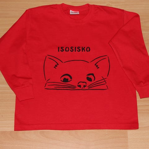 Nätti 104 koon kissa haalari. Häntä takana ja hupussa kissan silmät.