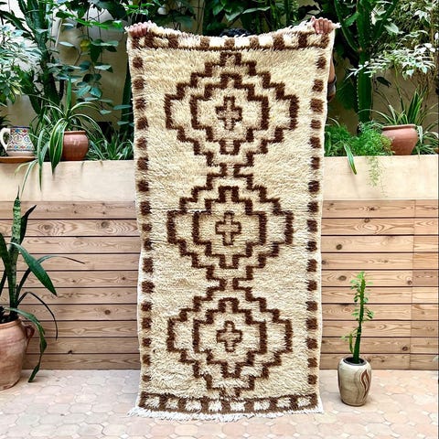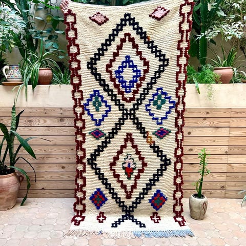 Ihana marokkolainen paimentolaismatto. Matto on kotoisin Marokon Azilal-kylästä. Mielenkiintoisesti Azilal-matot ovat löydetty vasta viime vuosikymmeninä. Niissä on usein valkean pohjan lisäksi ihastuttavia värejä symbolisissa yksityiskohdussa. Matot ovat alunperin käsinsolmittu omaan kotiin. Azilal-matot valmistetaan lampaanvillasta, johon on joskus sekoitettu puuvillaa yksityiskohtia varten.Kulumaa reunoissa, ei vaikuta käyttöön. Huomioitu hinnassa.