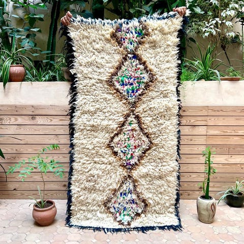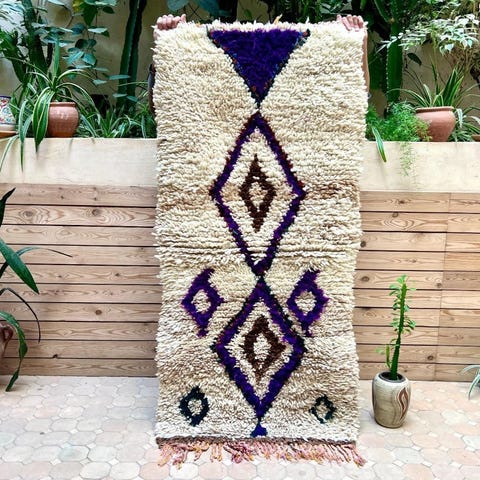 Ihana marokkolainen paimentolaismatto. Matto on kotoisin Marokon Azilal-kylästä. Mielenkiintoisesti Azilal-matot ovat löydetty vasta viime vuosikymmeninä. Niissä on usein valkean pohjan lisäksi ihastuttavia värejä symbolisissa yksityiskohdussa. Matot ovat alunperin käsinsolmittu omaan kotiin. Azilal-matot valmistetaan lampaanvillasta, johon on joskus sekoitettu puuvillaa yksityiskohtia varten.Kulumaa reunoissa, ei vaikuta käyttöön. Huomioitu hinnassa.