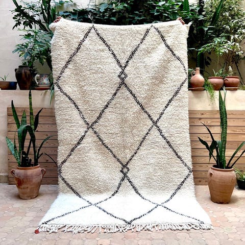 Klassisen tyylikäs, ajattoman kaunis Beni Ouarain paimentolaismatto! Erittäin laadukasta pehmeää ja värjäämätöntä lampaanvillaa korkealta vuoristosta. Nykyään lähes kaikkia marokkolaisia mustavalkoisia mattoja kutsutaan virheellisesti beni ouaraineiksi, mutta tämä on niiden oikeiden Ouarain ja Marmoucha -heimojen valmistama. Näitä jo Alvar Aalto, Le Corbusier ja lukuisat muut arkkitehdit suosivat, ja vastaavia mattoja on edelleen Artekin valikoimissa. Ihana matto vaikkapa olohuoneeseen, julkiseen tilaan tai suurempaan makkariin. Juuri käsinsolmittu ja käyttämätön matto.