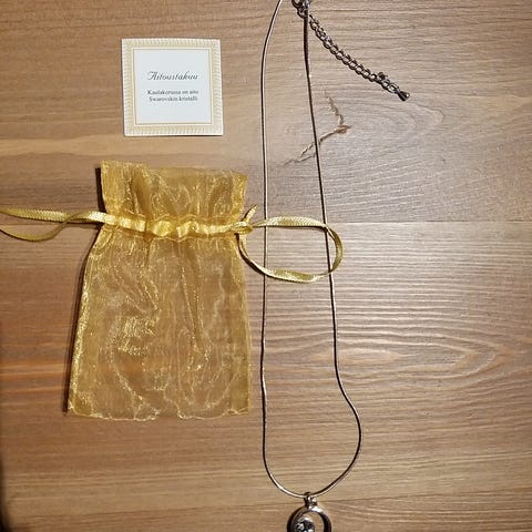 Hopeinen kaulakoru (Lempikoru merkkiä) kolmella pinkillä zirkonilla. Kotelo mukaan. Ketjun pituus 50 cm.