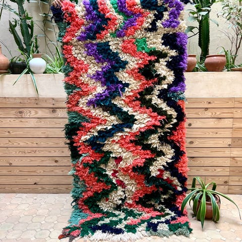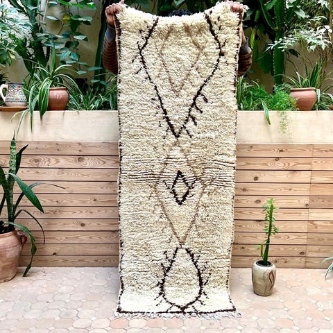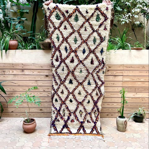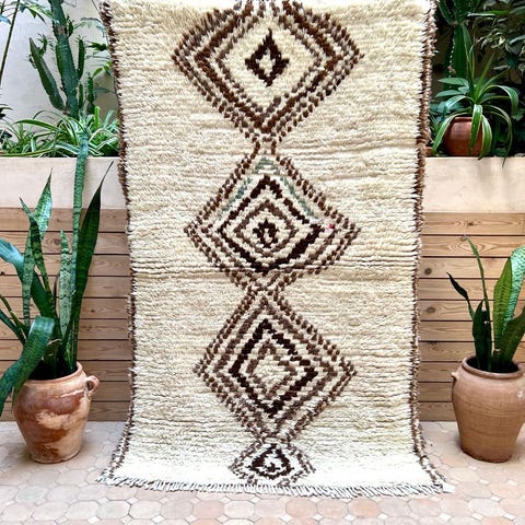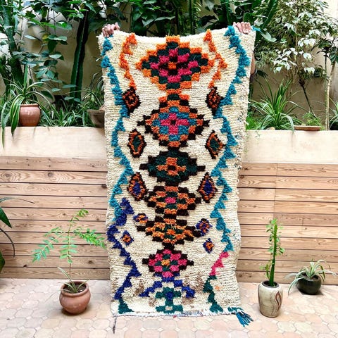 Ihana marokkolainen paimentolaismatto. Matto on kotoisin Marokon Azilal-kylästä. Mielenkiintoisesti Azilal-matot ovat löydetty vasta viime vuosikymmeninä. Niissä on usein valkean pohjan lisäksi ihastuttavia värejä symbolisissa yksityiskohdussa. Matot ovat alunperin käsinsolmittu omaan kotiin. Azilal-matot valmistetaan lampaanvillasta, johon on joskus sekoitettu puuvillaa yksityiskohtia varten.Kulumaa reunoissa, ei vaikuta käyttöön. Huomioitu hinnassa.
