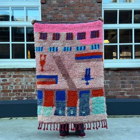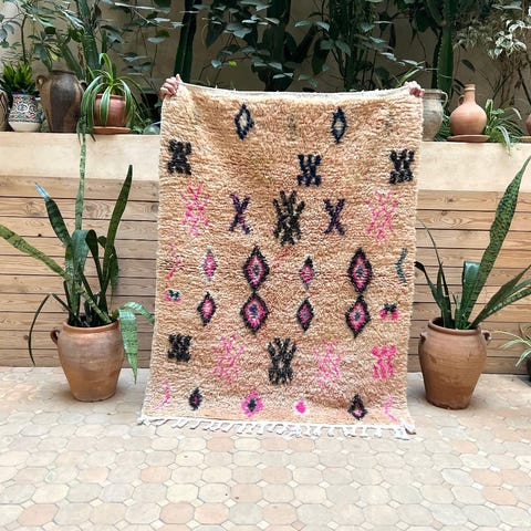 Ihastuttava marokkolainen käsinsolmittu matto. Matto on käyttämätön ja juuri pesty valmistuksen jälkeen. Tämän kun kerran lattialle asettaa, on siitä vaikea luopua. Boujaad on perinteinen berberien matonkutomisalue Marokossa. Perinteisten kuvioiden lisäksi sieltä tulee tänäpäivänä upeita moderneja mattoja, jotka ovat ainutlaatuisia värienkäytön ja käsityön taidonnäytteitä.