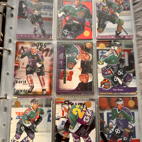 Erilaisia jääkiekkoaiheisia keräilykortteja, jotka sisältävät useita pelaajia eri vuosilta ja eri joukkueista. Kortit vaihtelevat tyyliin ja sisältävät erilaisia pelaajakuva-aiheita, mukaan lukien allekirjoituksia ja erikoispainoksia. Kortit soveltuvat keräilyyn ja lajista kiinnostuneille.