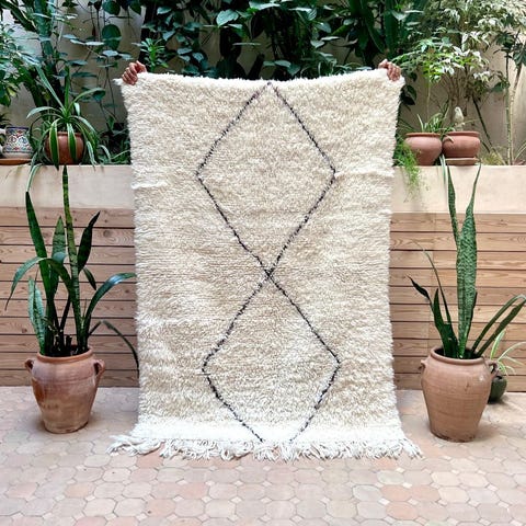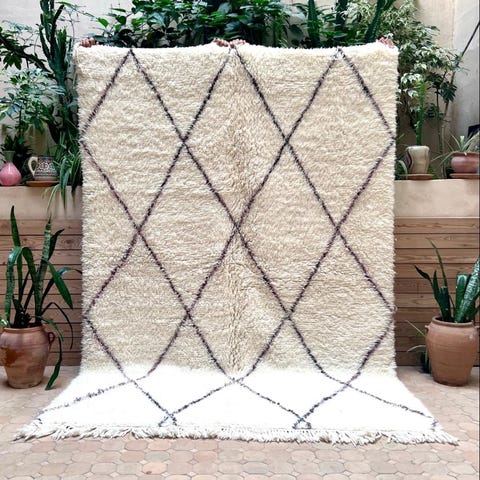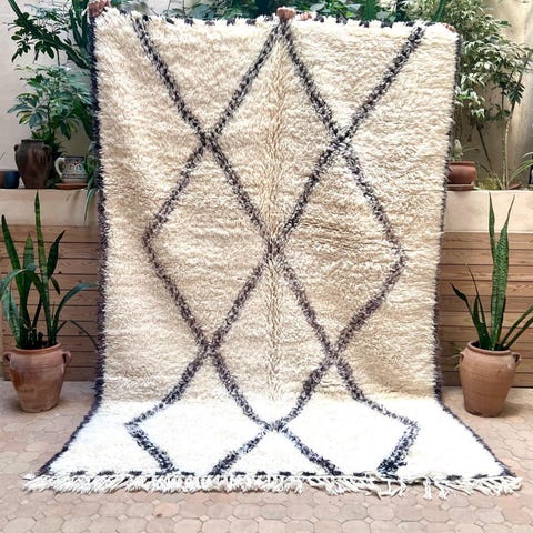 Klassisen tyylikäs, ajattoman kaunis Beni Ouarain paimentolaismatto! Erittäin laadukasta pehmeää ja värjäämätöntä lampaanvillaa korkealta vuoristosta. Nykyään lähes kaikkia marokkolaisia mustavalkoisia mattoja kutsutaan virheellisesti beni ouaraineiksi, mutta tämä on niiden oikeiden Ouarain ja Marmoucha -heimojen valmistama. Näitä jo Alvar Aalto, Le Corbusier ja lukuisat muut arkkitehdit suosivat, ja vastaavia mattoja on edelleen Artekin valikoimissa. Ihana matto vaikkapa olohuoneeseen, julkiseen tilaan tai suurempaan makkariin. Juuri käsinsolmittu ja käyttämätön matto.
