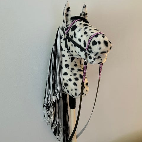 Hevonen ommeltu huolellisesti ompelukoneella. Harja, korvat, silmät ja sieraimet kiinnitetty käsin. Korvissa kovikkeet.