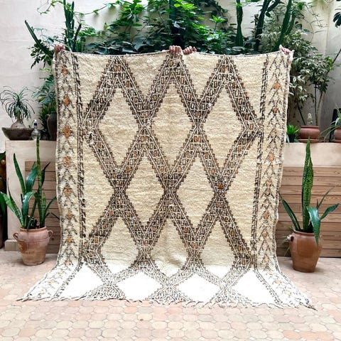 Aito vanha upea marmoucha-heimon berberinaisten solmima paimentolaismatto! Marmoucha on heimo, joka asuu kuuluisamman beni Ouarainin vieressä. Näiden matot ovat kuuluisimpia marokkolaisista matoista. Maton kuvioinnit ovat heimokieltä, jotka puhuvat omaa ikuista kieltään ja ovat myös itseilmaisun keino berberinaisille. Näitä mattoja jo Alvar Aalto, Le Corbusier ja lukuisat muut arkkitehdit suosivat. Aitoja vanhoja beni ouarain ja Marmoucha-mattoja ei ole enää runsaasti jäljellä, joten vuosikymmenten saatossa tämä on keräilykappale. Koko noin 270x185cm+ hapsut perinteen mukaan toisessa päässä. Matto on kevyt ja helppo imuroida ja käsitellä. Tyylikkäästi patimoitunut yksilö.