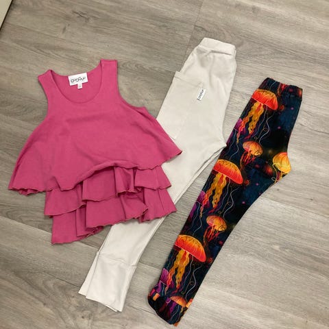 Gugguu kaksiväriset leggingsit koko 110. Käytetty harvakseltaan (ei monesti) . Erittäin siistit, ei kulumaa ei tahraa jne. Gugguu kalla paita väri nude. Uusi ja laput kiinni koko 116. Eläimetön ja tuoksuton koti.
