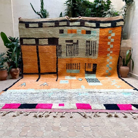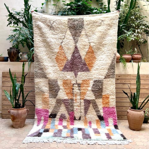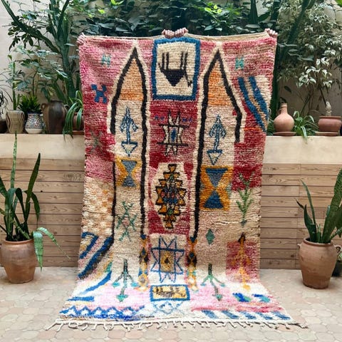 Ihastuttava marokkolainen käsinsolmittu matto. Matto on käyttämätön ja juuri pesty valmistuksen jälkeen. Tämän kun kerran lattialle asettaa, on siitä vaikea luopua. Boujaad on perinteinen berberien matonkutomisalue Marokossa. Perinteisten kuvioiden lisäksi sieltä tulee tänäpäivänä upeita moderneja mattoja, jotka ovat ainutlaatuisia värienkäytön ja käsityön taidonnäytteitä.