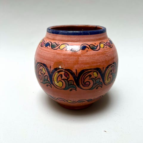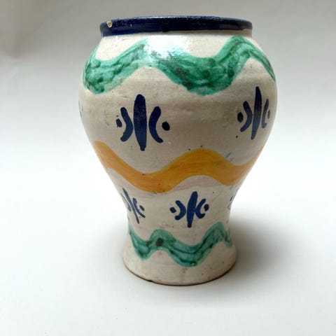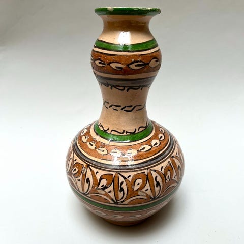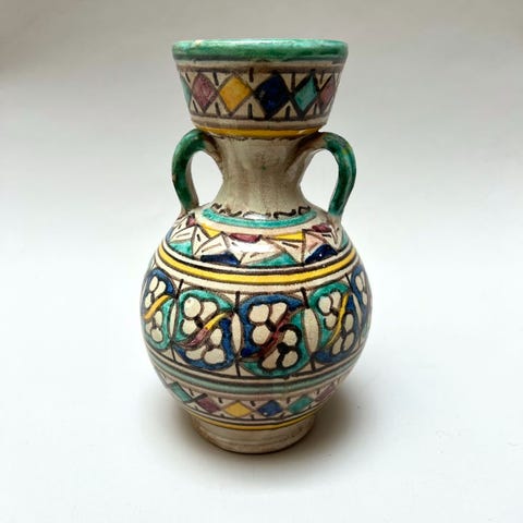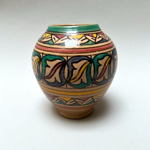 Tämä marokkolainen keraaminen maljakko on kaunista perinteisestä käsityötä. Marokkolainen keramiikka yhdistelee rohkeita värejä, monipuolisia kuvioita ja ainutlaatuisia muotoja.
