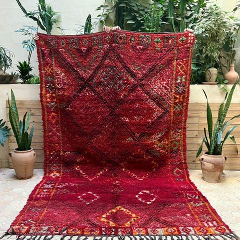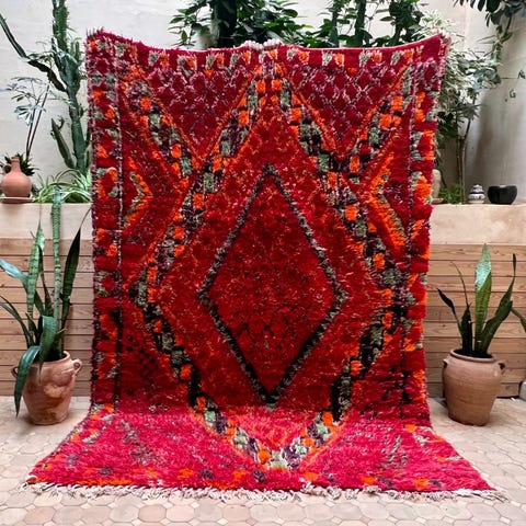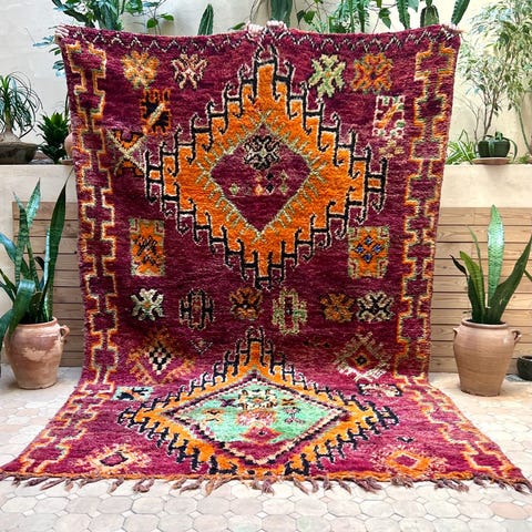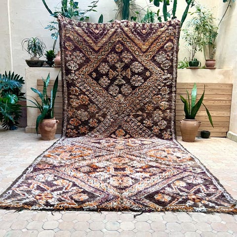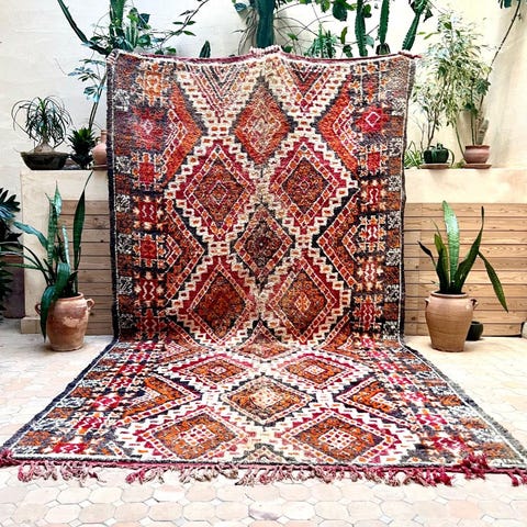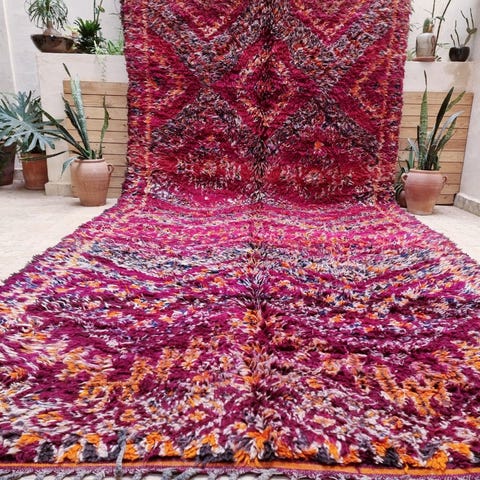 Beni m'guild heimon lampaanvillamatto vintage-matto upeissa sävyissä ja alkuperäisessä, erinomaisessa kunnossa. Luonnosta saaduilla väreillä värjätty, värin aikaansaamiseksi on käytetty kasveja, sieniä, yrttejä ja granaattiomenan siemeniä. Matto on arviolta jopa 60 vuotta vanha, berberien käsin tekemä Marokon Atlas-vuoristossa. Mainio kunto, ja värit toistuvat juuri niin upeina kuin aikoinaan. Sopii vaikkapa olohuoneen tai julkisen tilan keskipisteeksi, tai suuren ruokapöydän alle.Beni M'Guild tarkoittaa heimoja, jotka olivat alunperin osa vielä suurempaa ryhmää nimeltä Oumalou, joka tarkoittaa suomennettuna "varjojen kansaa". Nimi tuli heidän kotipaikastaan: he asuivat Atlas-vuorten jyrkänteillä, jonka huiput loivat varjoja kotien ylle. Lopulta M'Guild muutti lännemmäs Atlas-vuorilla kesäisimmille laitumille.Alkuperäiset Beni M'Guild matot ovat usein erittäin tiiviitä juurikin rajun ilmaston vuoksi. Matto on aikoinaan lämmittänyt solmijaansa ja hänen perhettään, ja toiminut myös sänkynä ja sohvana.
