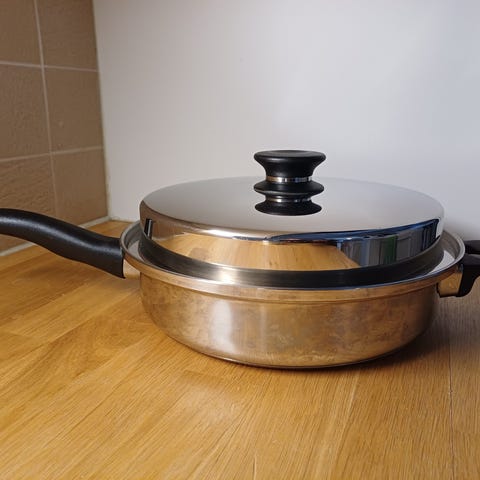 Teräksinen höyrykeitin ja kattila, joissa mustat kahvat, kansi ja lisäkansi. Yhteensopivat osat, jotka voidaan pinota päällekkäin tilan säästämiseksi.