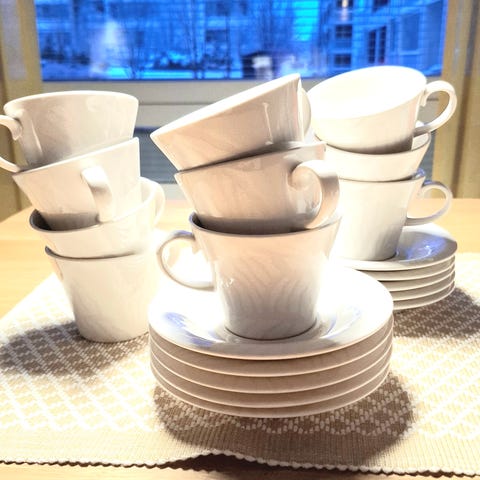 Pentikin Valo-sarjan muki 0,3l x2 ja lautanen 18cm x2. Mukeja käytetty jonkin verran, lautasia ei ollenkaan. Kunto lähes uuden veroinen.