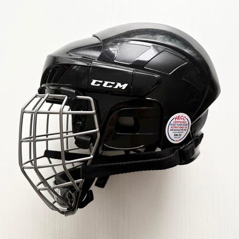 CCM jääkiekko kypärä, koko M. Kypärässä on säädettävä hihna ja sisäpehmusteet, jotka tarjoavat suojaa ja mukavuutta jääkiekkoiluun.