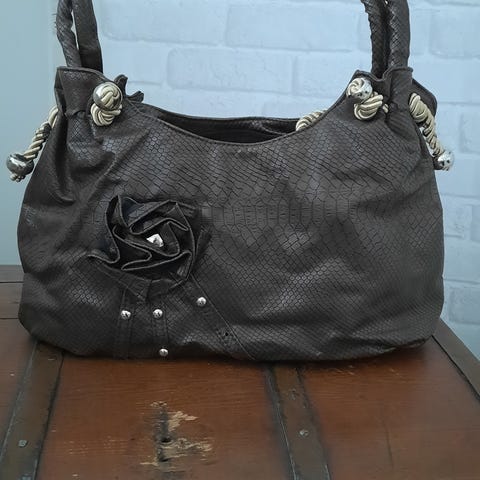 Kivoilla yksityiskohdilla varustettu pieni käsilaukku.