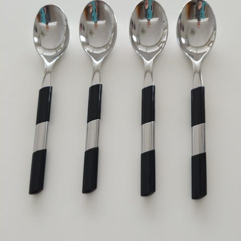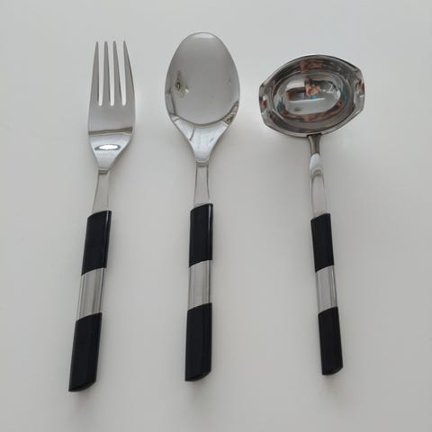 Hackman haarukat, joissa mustat kahvat. Setti sisältää kuusi haarukkaa. Materiaali ruostumatonta terästä ja muovia. Soveltuvat ruokailuvälineiksi.