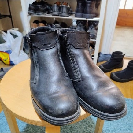 Olen käyttänyt tätä itse(nainen) villasukkien kanssa, oma jalka 42. Sen verran käytetty et näköjään sisäpuolelta kangas hiertynyt puhki, just huomasin ku kuvasin. Muutoin ihan tukevat kengät.
