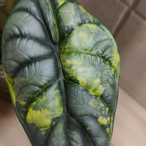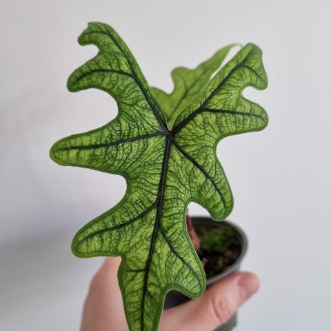 Juurakkovehka Alocasia Reginula "Black Velvet Pink Variegata" isot mukulat. Vielä kiinni emokasvissa, irrotan kun kaupat varmistuvat. Väri on tähän asti hyvin periytynyt jalkelaisille.