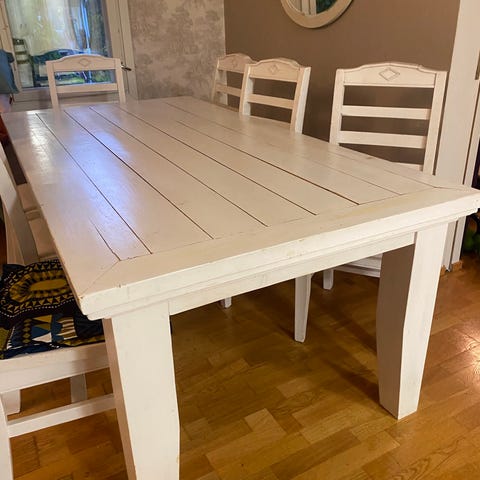 Täyttä mäntyä oleva puusepän tekemä ruokapöytä. Paksuutta reilusti 5 cm. Pinta vaatii hiontaa ja uudelleenkäsittelyä. Ensimmäisen kuvan oton jälkeen pöydän päädyn reunat on pyöristetty. Saarekkeeseen kiinni tuleva reuna on kulmistaan 90 astetta.
