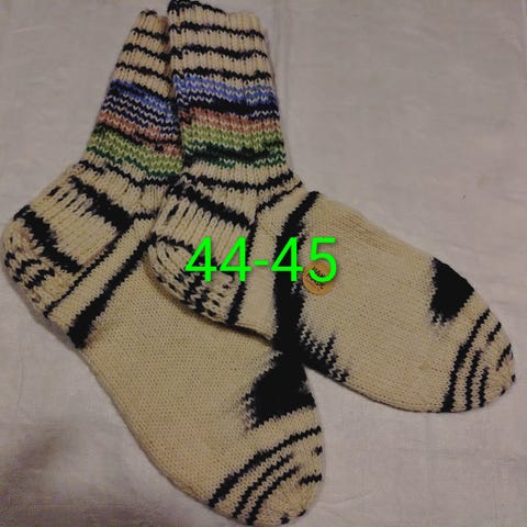 Seitsemän Veljestä-langoista käsin neulottuja villasukkia.