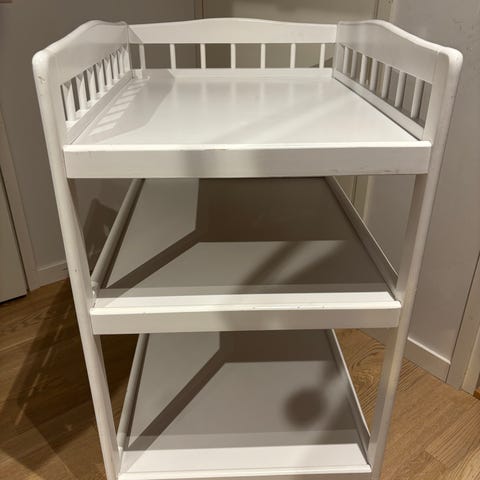 Ikea hoitopöytä, jossa kaksi tasoa ja kolme irrotettavaa valkoista irroitettavaa kippoa. Sopii vauvan hoitamiseen ja vaipanvaihtoon. Materiaali puu ja muovi.