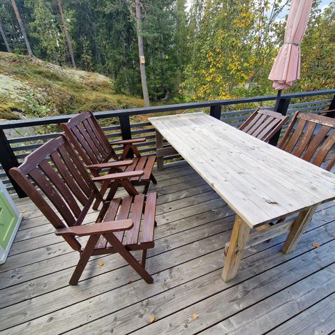 Puu pihakalustesetti, johon kuuluu kaksi tuolia ja pöytä. Setti on ruskeaa puuta ja soveltuu ulkokäyttöön.