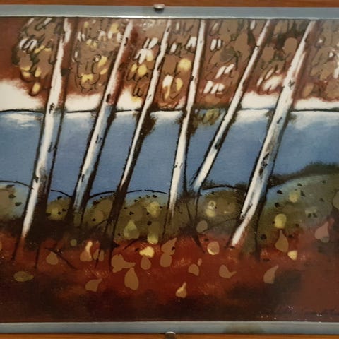 Heljä Liukko-Sundströmin "punainen tupa ja perunamaa", leveys n.25cm ja korkeus n.21cm, hennon hieno naarmu ikkunoiden välissä kun tarkkaan katsoo, nouto tai postitus