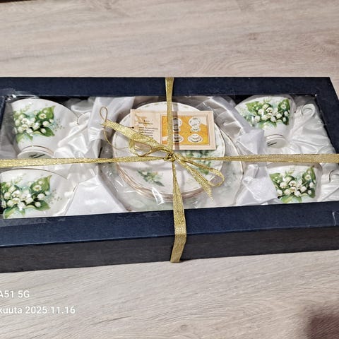 Kielo Luuposliinia kahvikuppi ja lautaset kukkakuvio