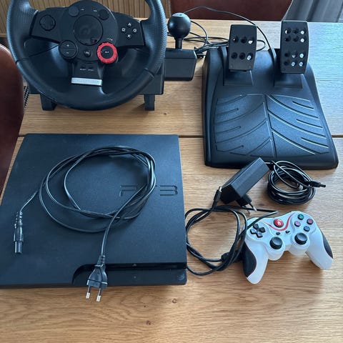 Playstation 3, peliohjain ja ajoteline sisältäen ohjauspyörän, polkimet ja istuimen. Sopii ajopelien pelaamiseen ja tarjoaa realistisen pelikokemuksen.