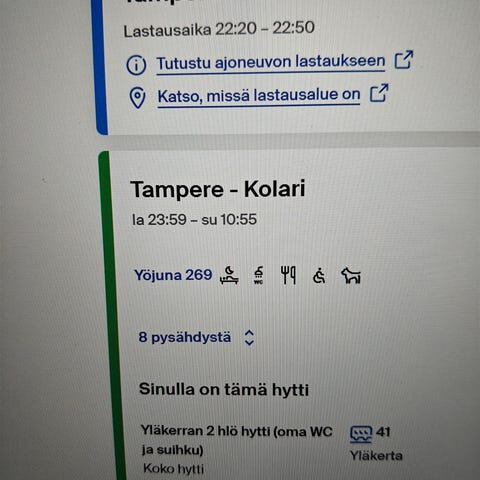 Tampere - Kolari la 31.1.2026 autojunalippu + hytti 2 hlölle