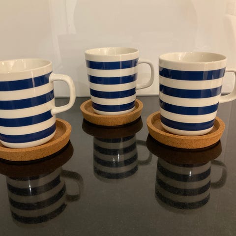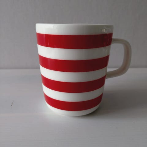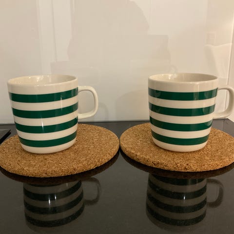 Marimekko Oiva Tasaraita muki 2,5 dl, väri vaal.vihreät raidat. Mukeja on 4 kpl. Käytössä olleet, mutta siistit. Raidat kuvissa vähän tummemmat mitä oikeasti ovat.