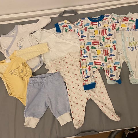 Lasten vaattee, koko 62, suunniteltu pojille. Mukana erilaisia vaatekappaleita, kuten housuja ja bodyja, jotka soveltuvat pienille lapsille.
