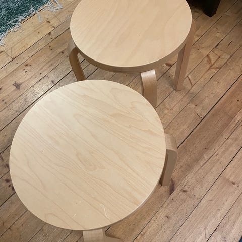 Myydään tarpeettomina muuton tieltä kaksi Artekin nelijalkaista Aalto E60-jakkaraa. Ostettu kesäkuussa 2024, ovat olleet todella vähäisessä käytössä. Jakkarat ovat hyvässä kunnossa ja kolhuttomia toisen jakkaran istuinlevyn pieniä jälkiä lukuunottamatta (jäljet näkyvät kolmessa viimeisessä kuvassa).