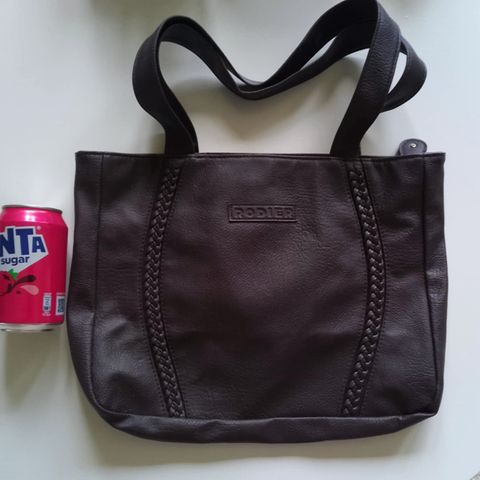 Big bag 37x44 cm of the brand Lloyd, fits laptops and sportswear same time, has many inside pockets. Real leather, some usage marks like spots and scratches but they are not visible when you wear the bag. No tears, quite reliable bag.