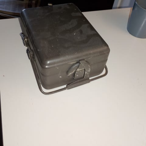 Sotilas kenttäastiasto, musta väri, kantokahvalla. Käytetty ulkoilmaan tai retkeilyyn soveltuva astiastopaketti. Materiaalina metalli, kuljetusta helpottava kantokahva.